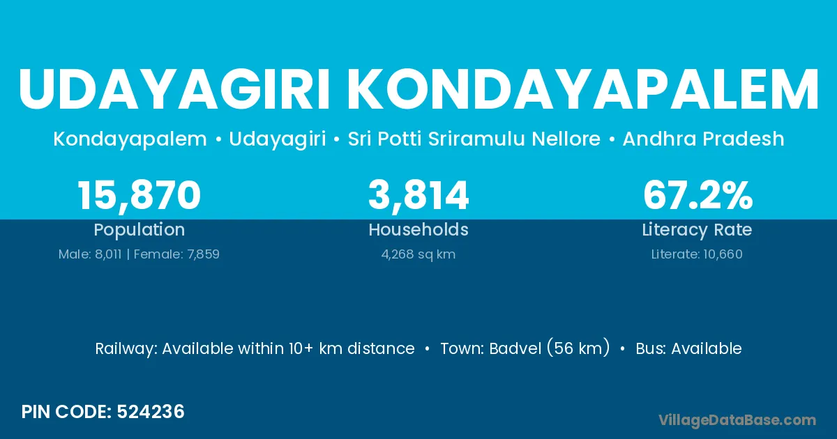 Udayagiri Kondayapalem village has a total population of 15,870 people, of which 8,011 are males and 7,859 are females.