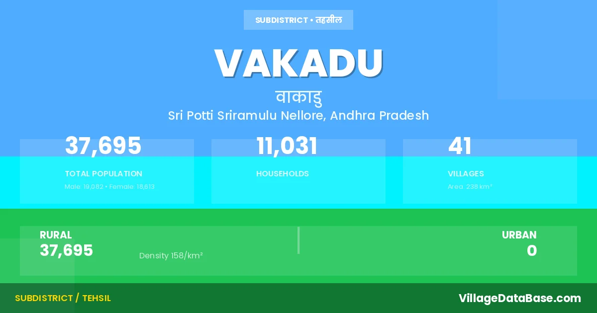 According to the 2011 census The total area of Vakadu Mandal is 238 km², with a population of 37695 people. The population density is 158 inhabitants per square kilometre, and there are approximately 11031 houses in the sub district.
