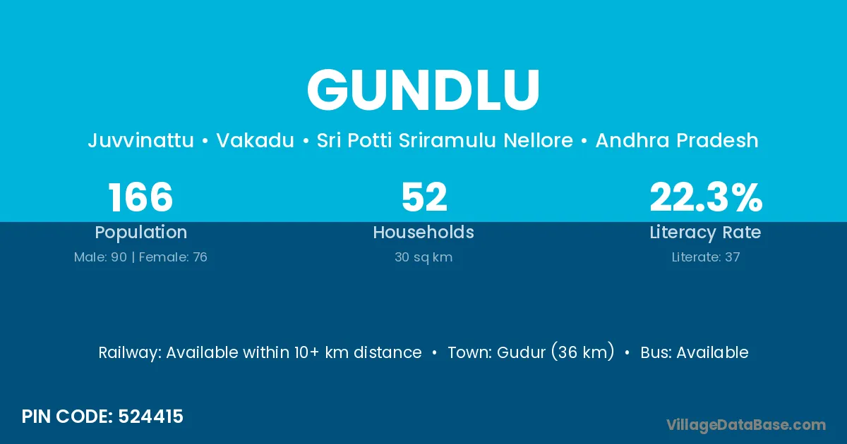 Gudur (36 km) is the nearest town to Gundlu village for major economic activities and is located approximately 36 km away.