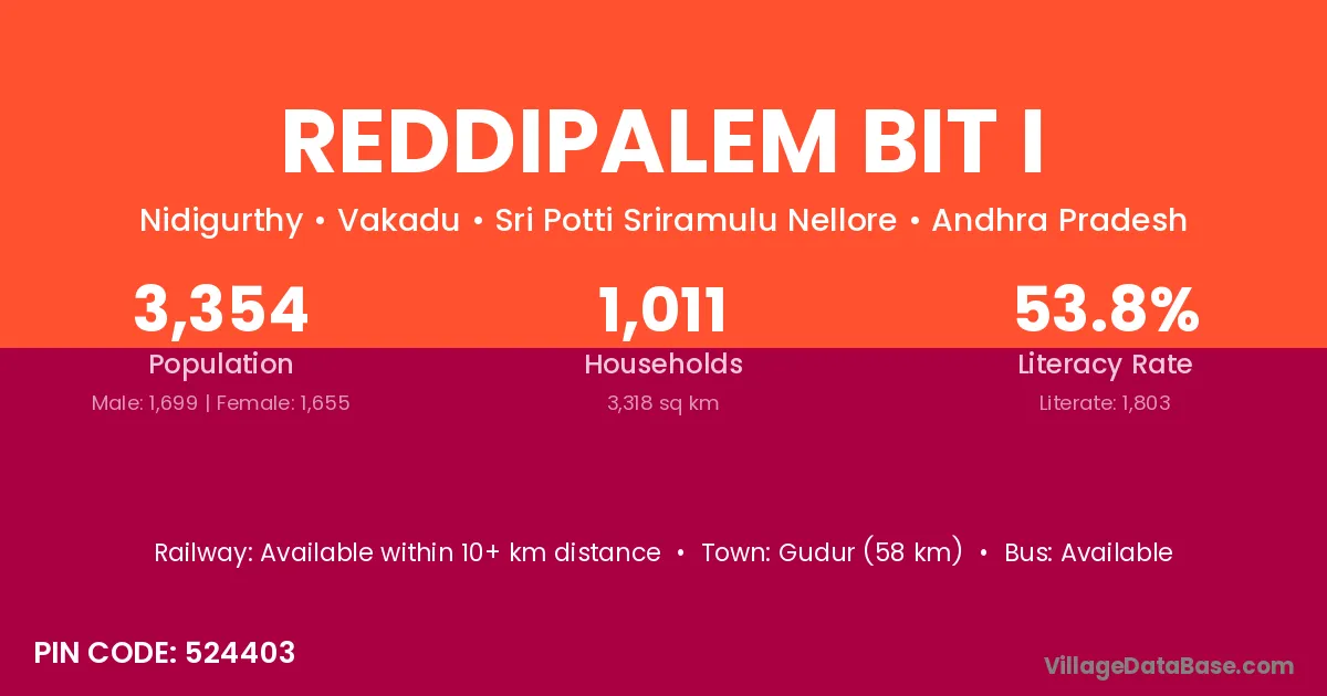 Gudur (58 km) is the nearest town to Reddipalem Bit I village for major economic activities and is located approximately 58 km away.
