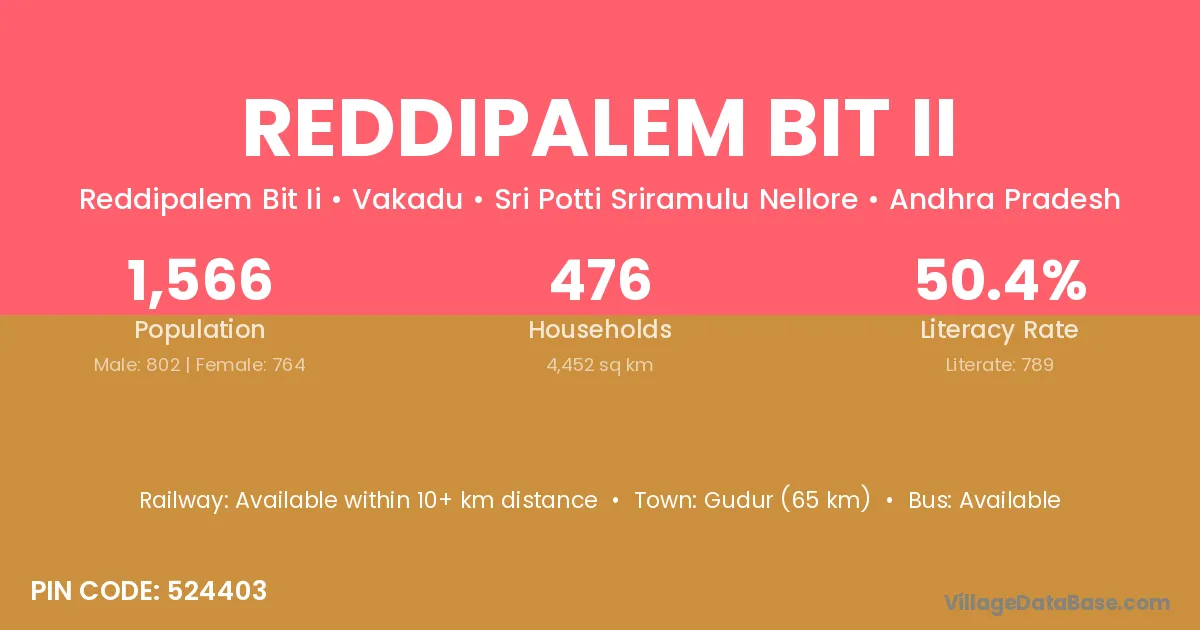 Reddipalem Bit Ii village has a total population of 1,566 people, of which 802 are males and 764 are females.