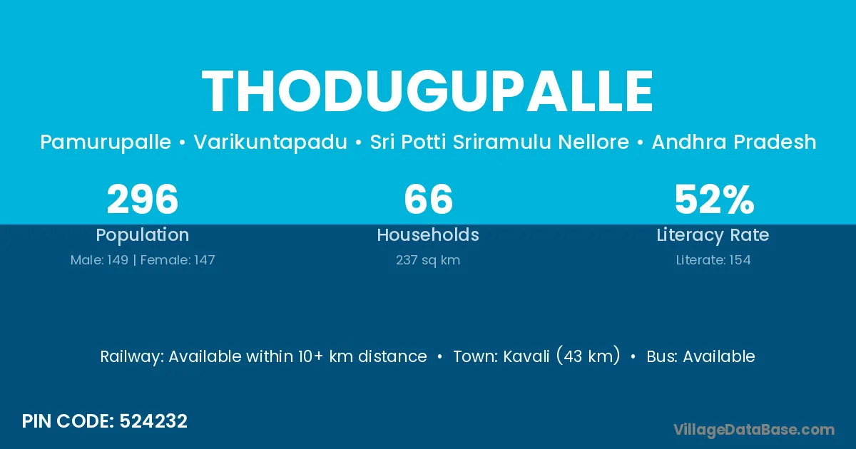 Kavali (43 km) is the nearest town to Thodugupalle village for major economic activities and is located approximately 43 km away.
