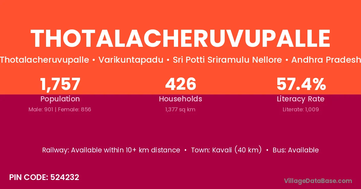 Kavali (40 km) is the nearest town to Thotalacheruvupalle village for major economic activities and is located approximately 40 km away.