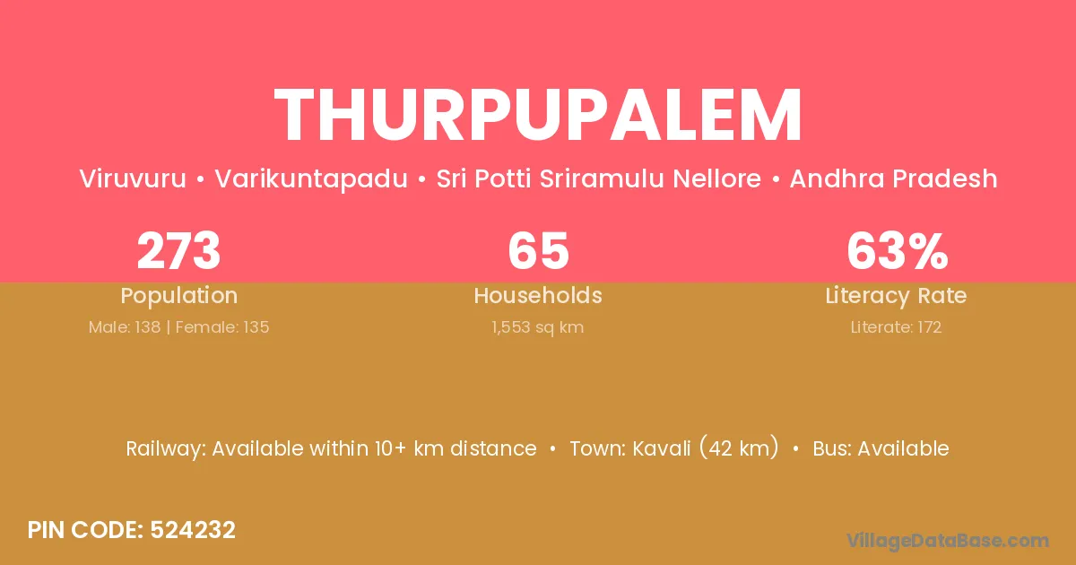 Kavali (42 km) is the nearest town to Thurpupalem village for major economic activities and is located approximately 42 km away.