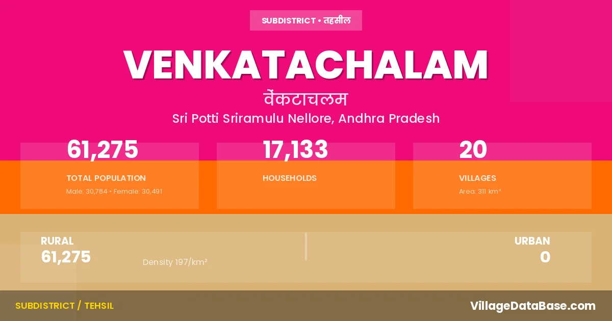 According to the 2011 census The total area of Venkatachalam Mandal is 311 km², with a population of 61275 people. The population density is 197 inhabitants per square kilometre, and there are approximately 17133 houses in the sub district.
