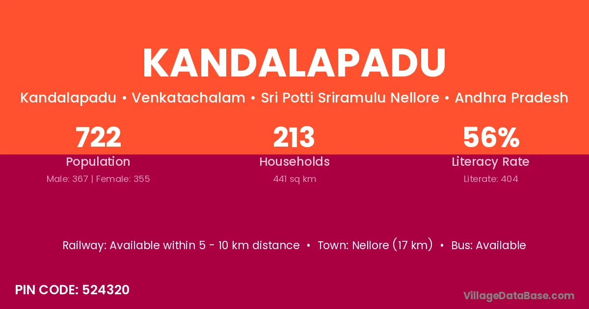Nellore (17 km) is the nearest town to Kandalapadu village for major economic activities and is located approximately 17 km away.