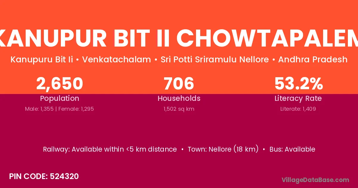 Kanupur Bit Ii Chowtapalem village has a total population of 2,650 people, of which 1,355 are males and 1,295 are females.