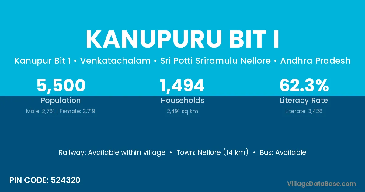 Nellore (14 km) is the nearest town to Kanupuru Bit I village for major economic activities and is located approximately 14 km away.