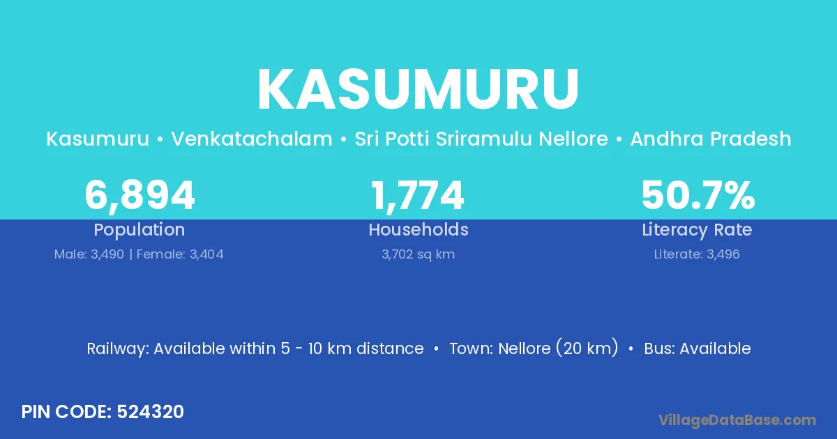 Nellore (20 km) is the nearest town to Kasumuru village for major economic activities and is located approximately 20 km away.