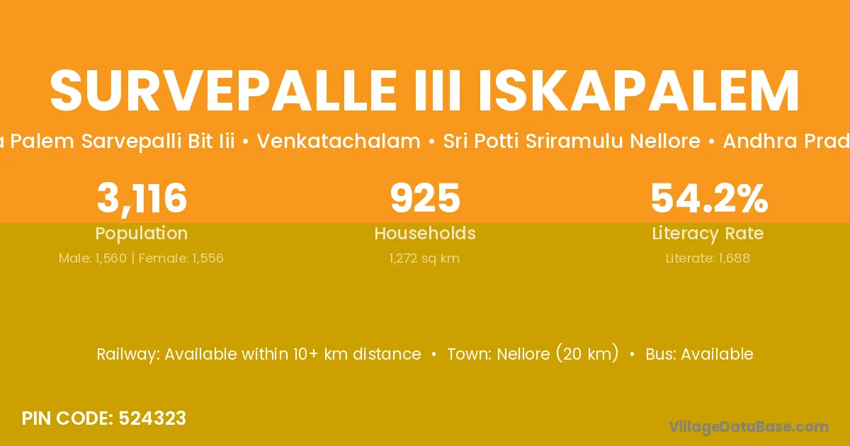 Survepalle Iii Iskapalem village has a total population of 3,116 people, of which 1,560 are males and 1,556 are females.