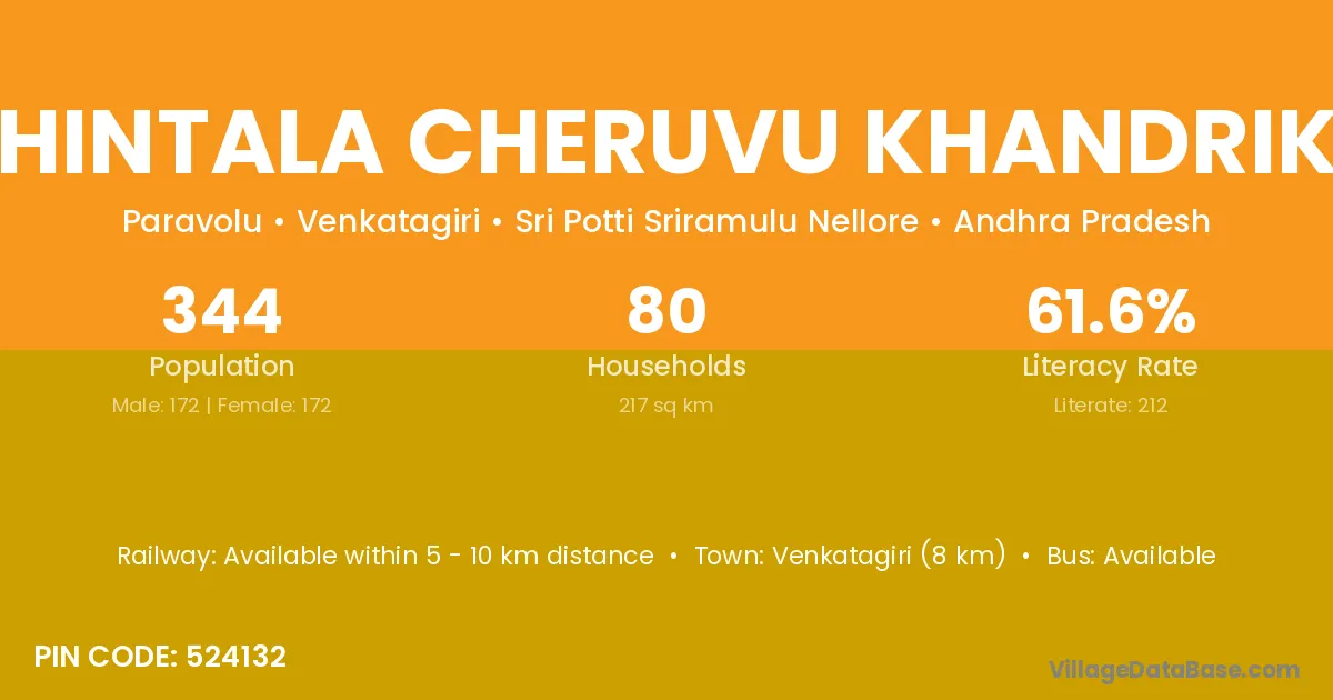Chintala Cheruvu Khandrika village has a total population of 344 people, of which 172 are males and 172 are females.