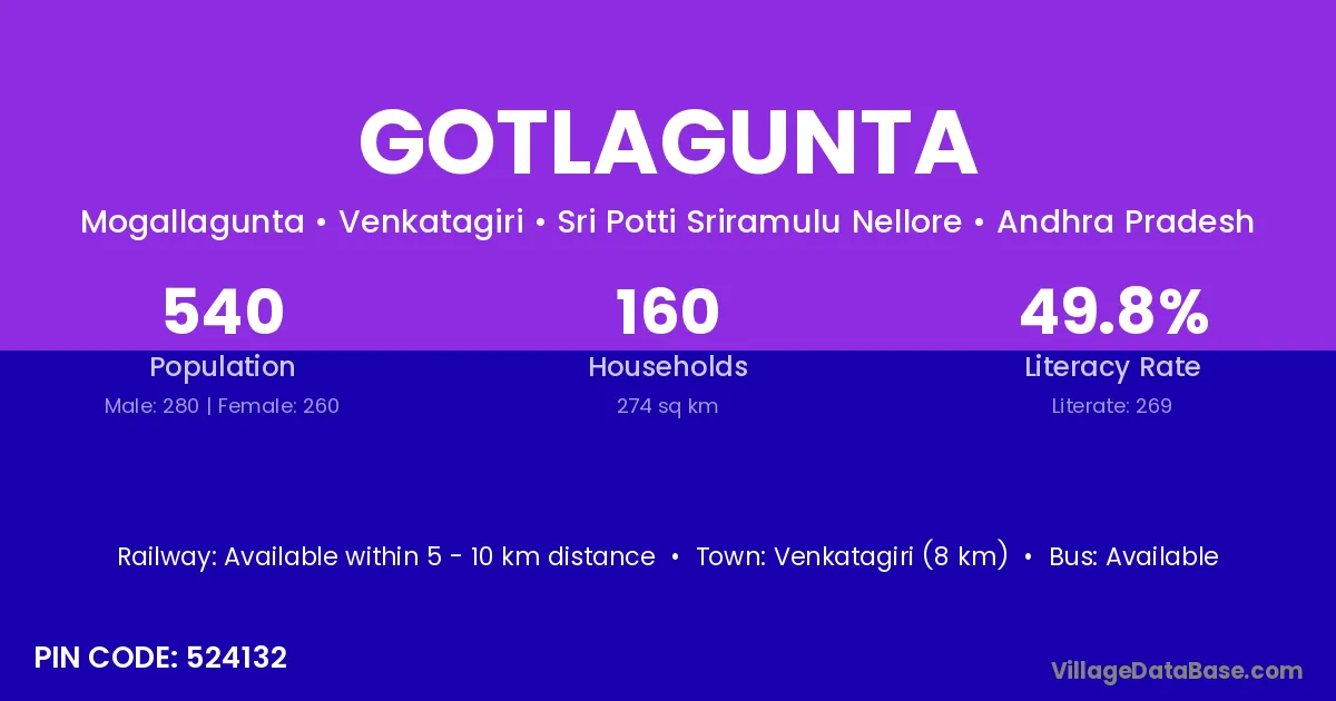 Venkatagiri (8 km) is the nearest town to Gotlagunta village for major economic activities and is located approximately 8 km away.