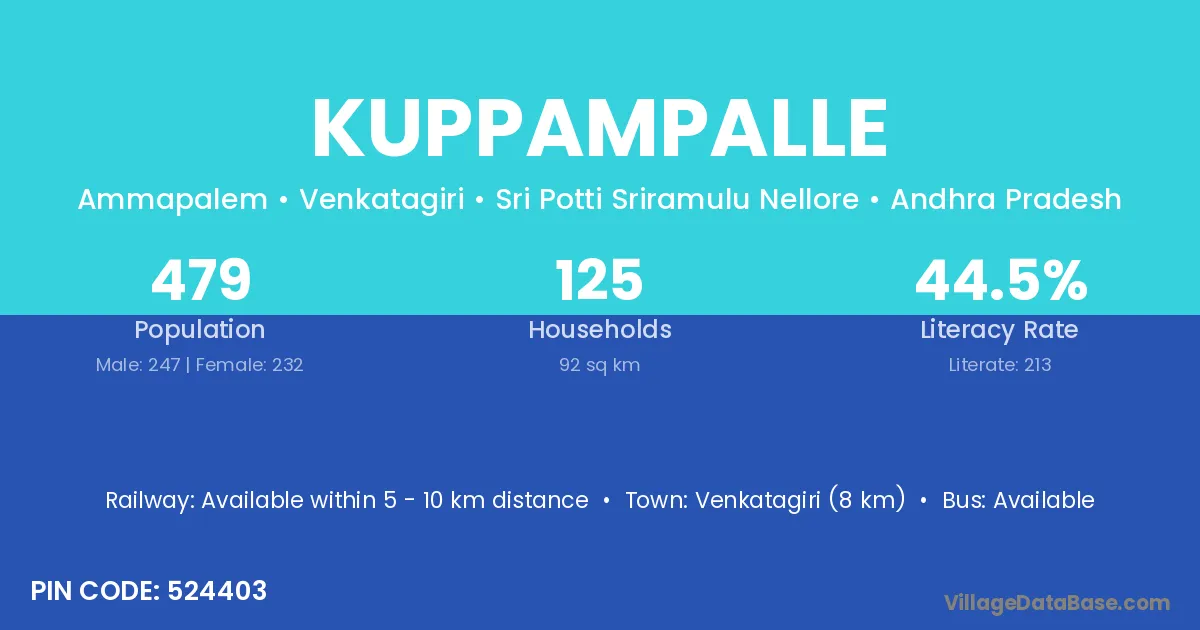 Venkatagiri (8 km) is the nearest town to Kuppampalle village for major economic activities and is located approximately 8 km away.