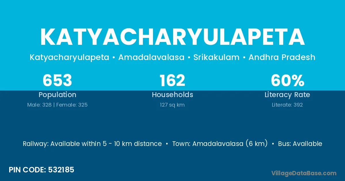 Amadalavalasa (6 km) is the nearest town to Katyacharyulapeta village for major economic activities and is located approximately 6 km away.