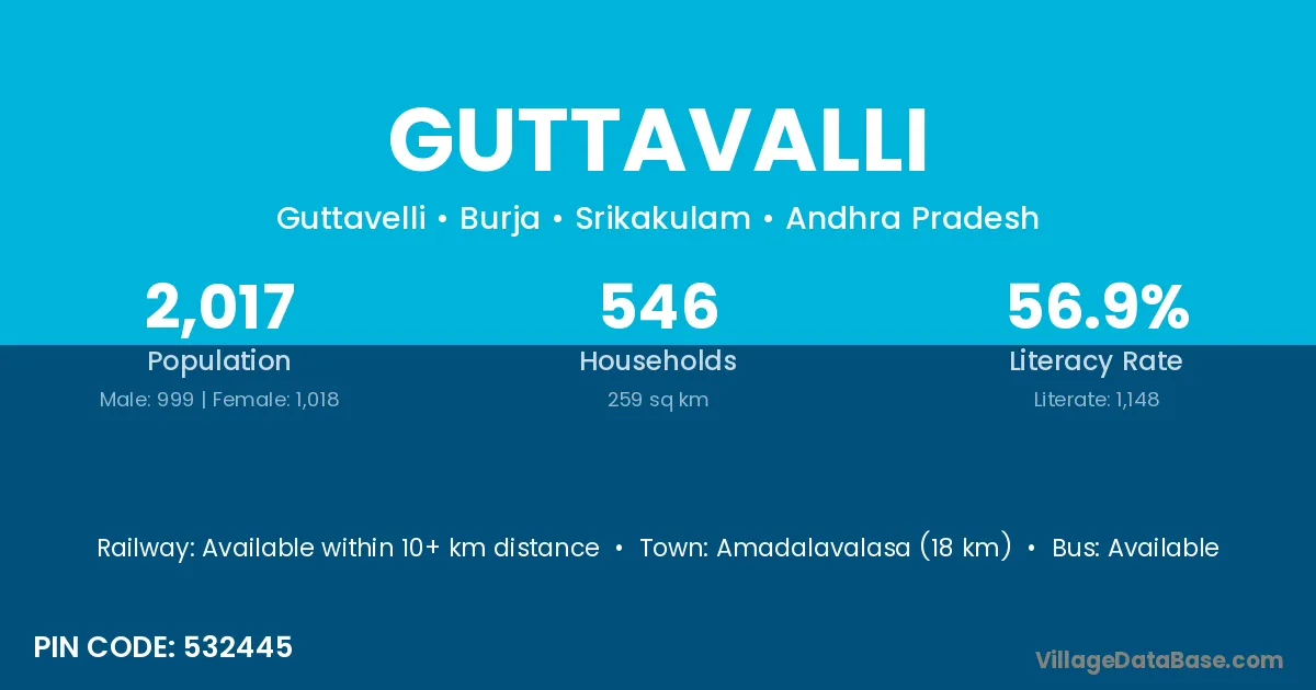 Amadalavalasa (18 km) is the nearest town to Guttavalli village for major economic activities and is located approximately 18 km away.