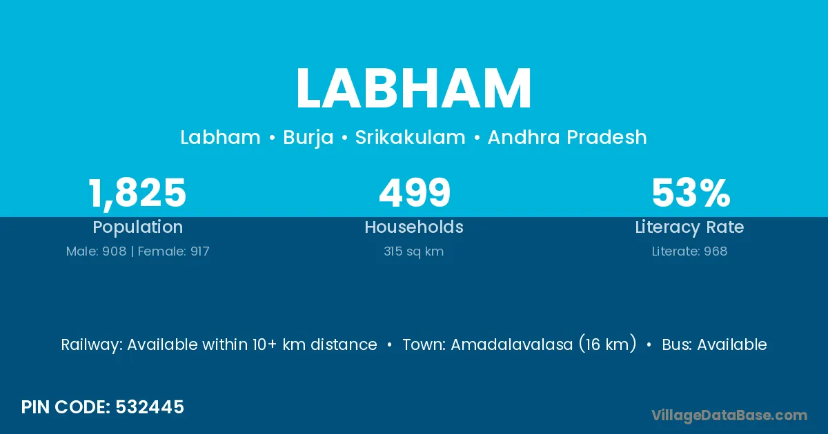 Amadalavalasa (16 km) is the nearest town to Labham village for major economic activities and is located approximately 16 km away.