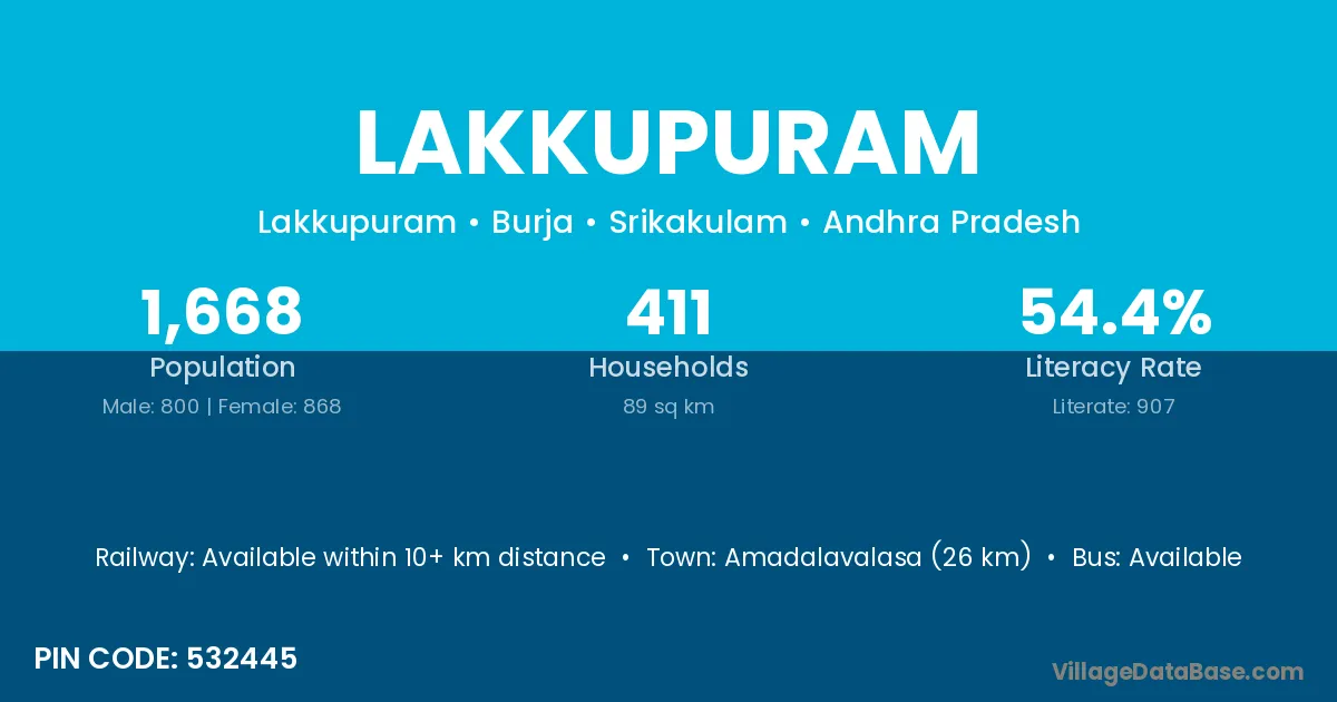 Amadalavalasa (26 km) is the nearest town to Lakkupuram village for major economic activities and is located approximately 26 km away.