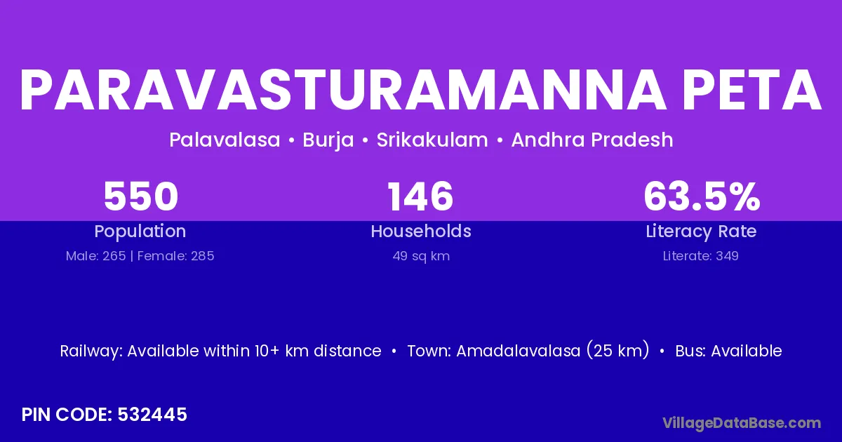 Amadalavalasa (25 km) is the nearest town to Paravasturamanna Peta village for major economic activities and is located approximately 25 km away.