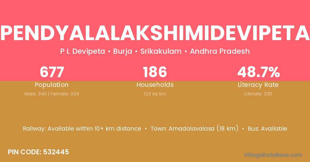 Amadalavalasa (18 km) is the nearest town to Pendyalalakshimidevipeta village for major economic activities and is located approximately 18 km away.