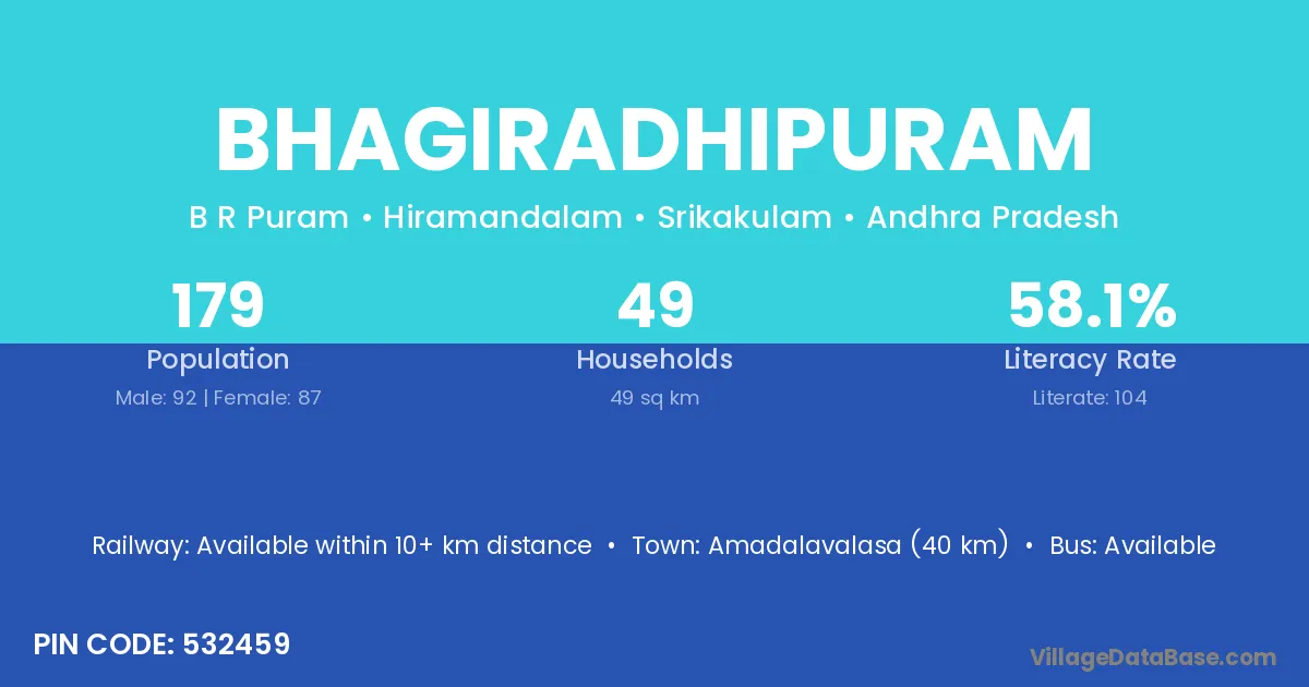 Srikakulam (20 km) is the nearest town to Bhagiradhipuram village for major economic activities and is located approximately 20 km away.
