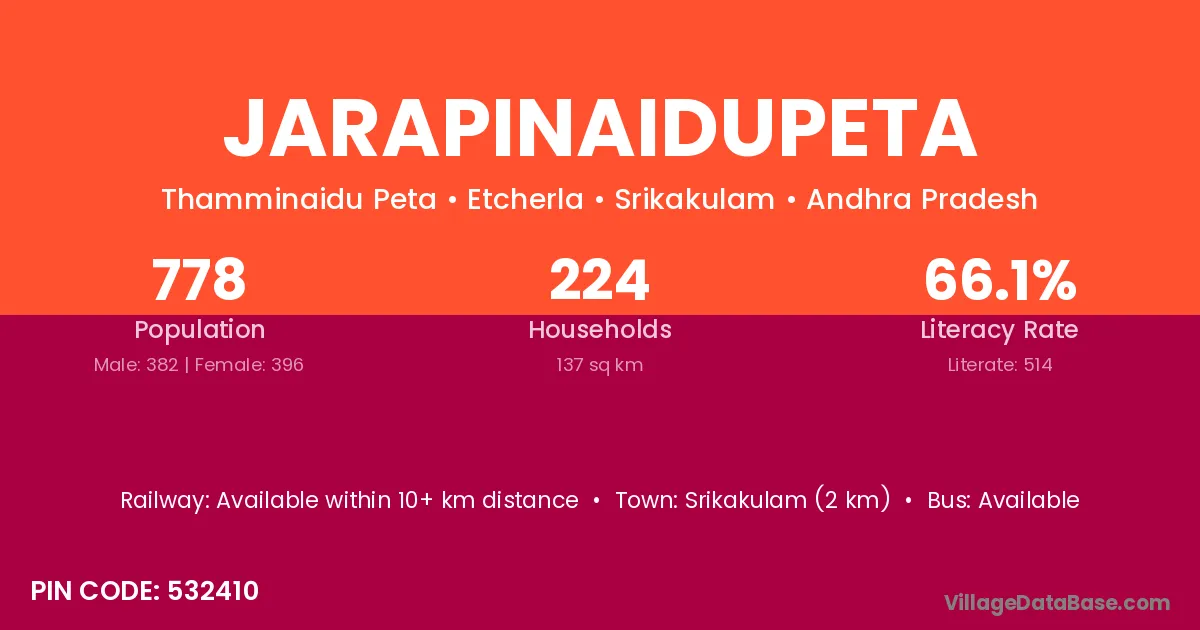 Srikakulam (2 km) is the nearest town to Jarapinaidupeta village for major economic activities and is located approximately 2 km away.