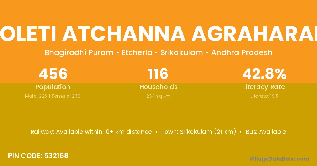 Voleti Atchanna Agraharam village has a total population of 456 people, of which 226 are males and 230 are females.