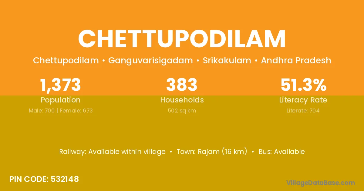 Rajam (16 km) is the nearest town to Chettupodilam village for major economic activities and is located approximately 16 km away.