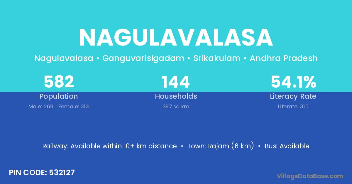Nagulavalasa village has a total population of 582 people, of which 269 are males and 313 are females.