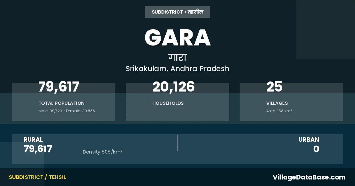 Gara is a town and Mandal in the Srikakulam district of the Andhra Pradesh. In India, a Mandal is a subdivision of a district responsible for the administration and revenue collection of a specific area within the district. Mandals play a crucial role in the local governance structure, contributing significantly to the development and administration of their communities.