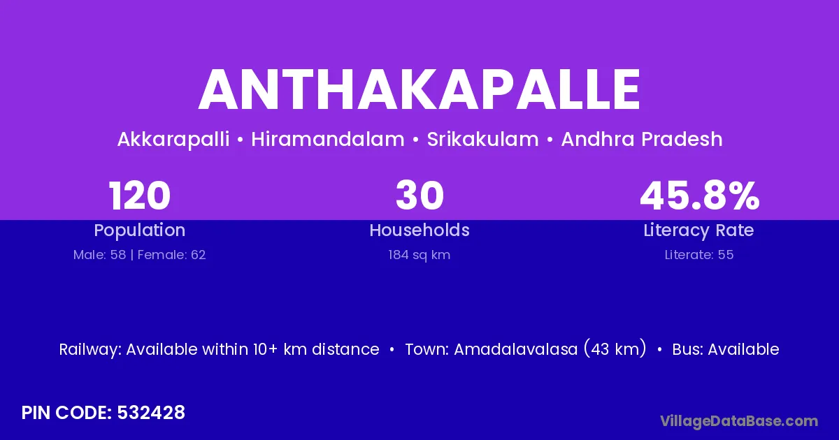 Anthakapalle village has a total population of 120 people, of which 58 are males and 62 are females.