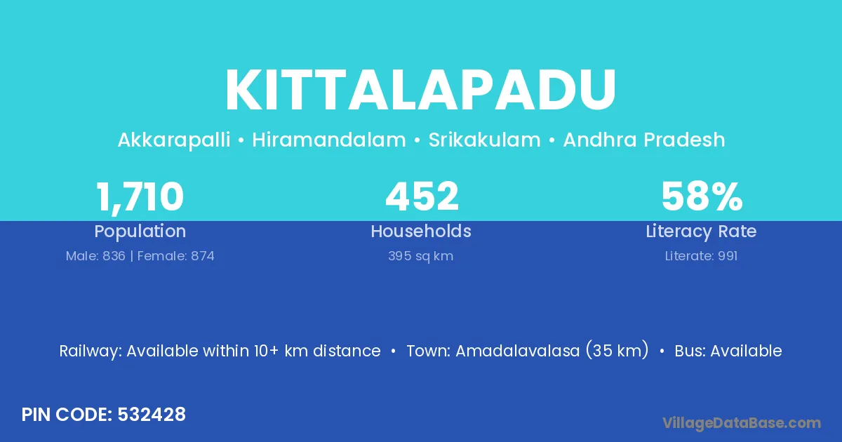 Amadalavalasa (35 km) is the nearest town to Kittalapadu village for major economic activities and is located approximately 35 km away.