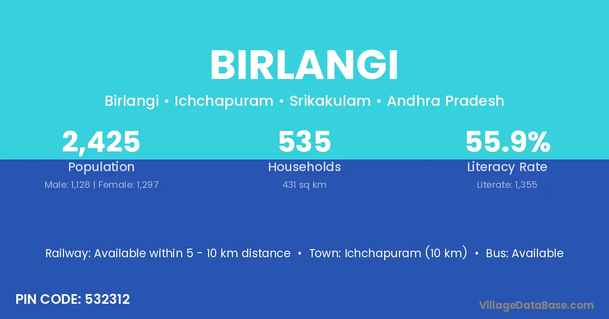 Ichchapuram (10 km) is the nearest town to Birlangi village for major economic activities and is located approximately 10 km away.