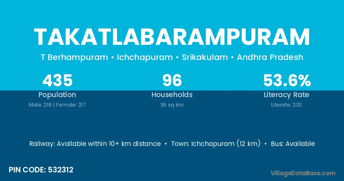 Ichchapuram (12 km) is the nearest town to Takatlabarampuram village for major economic activities and is located approximately 12 km away.
