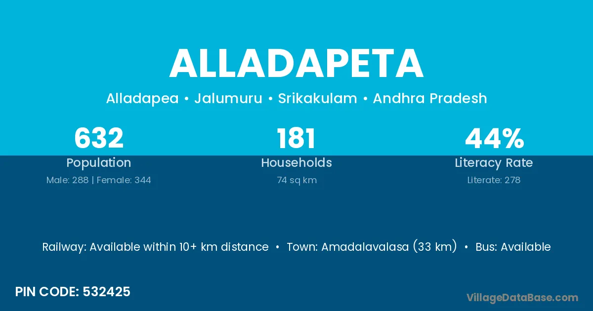 Amadalavalasa (33 km) is the nearest town to Alladapeta village for major economic activities and is located approximately 33 km away.