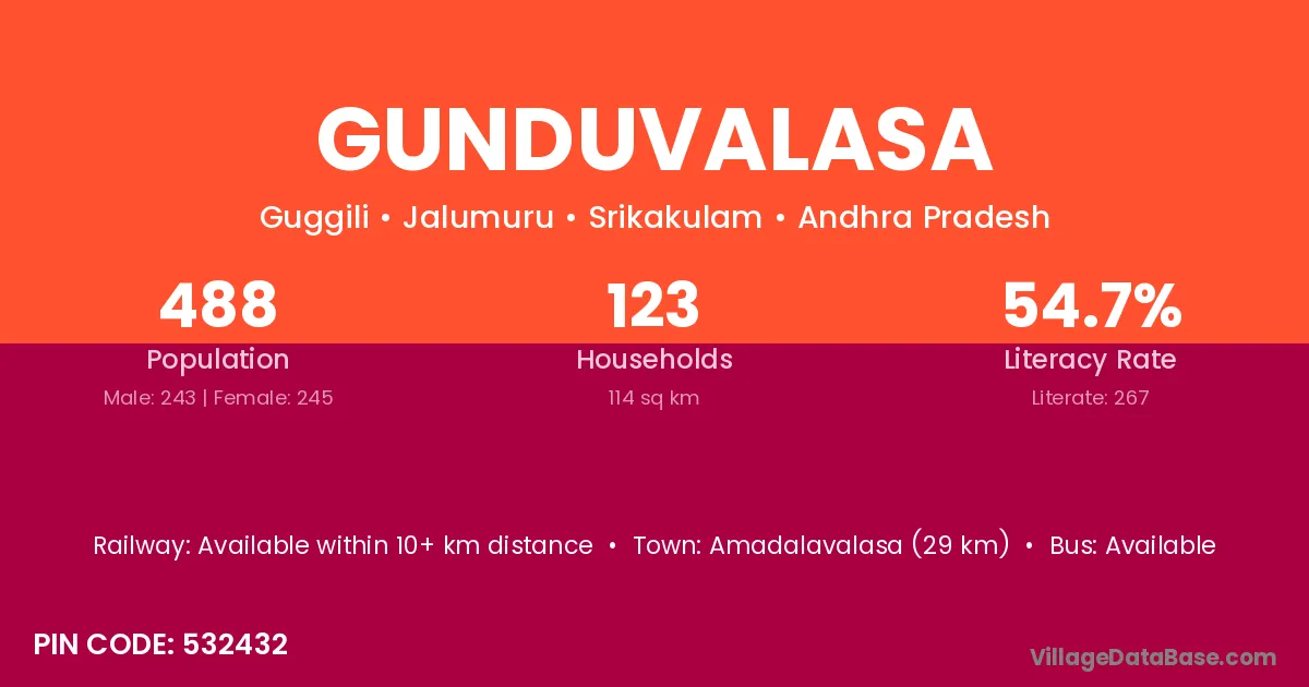 Gunduvalasa village has a total population of 488 people, of which 243 are males and 245 are females.