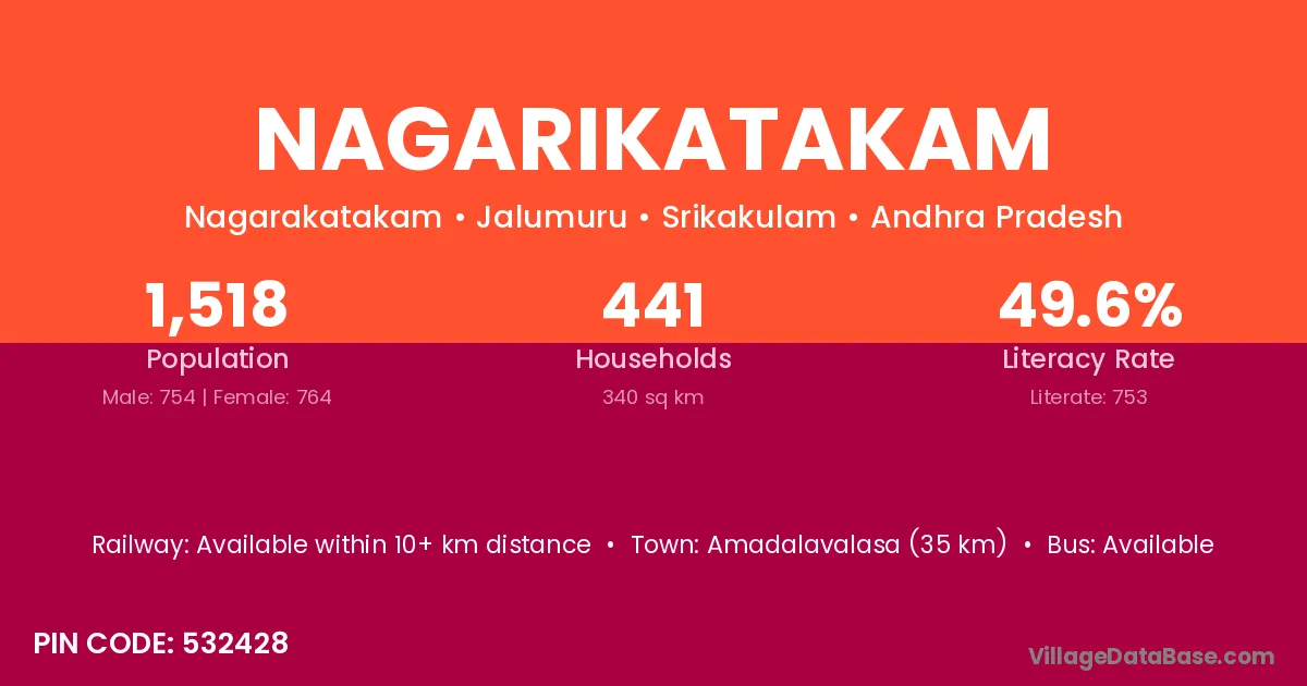 Amadalavalasa (35 km) is the nearest town to Nagarikatakam village for major economic activities and is located approximately 35 km away.