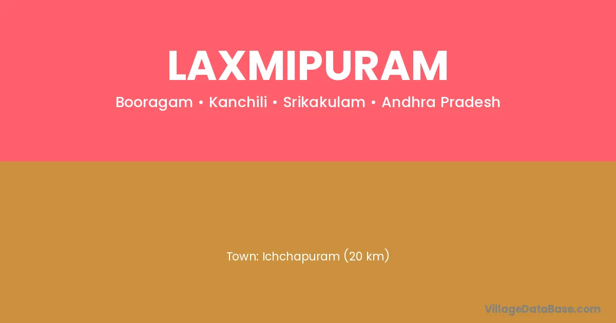 Ichchapuram (20 km) is the nearest town to Laxmipuram village for major economic activities and is located approximately 20 km away.