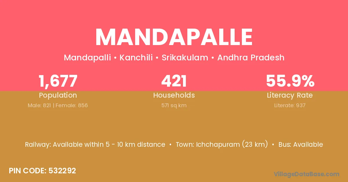Ichchapuram (23 km) is the nearest town to Mandapalle village for major economic activities and is located approximately 23 km away.