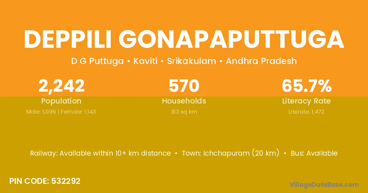 Ichchapuram (20 km) is the nearest town to Deppili Gonapaputtuga village for major economic activities and is located approximately 20 km away.