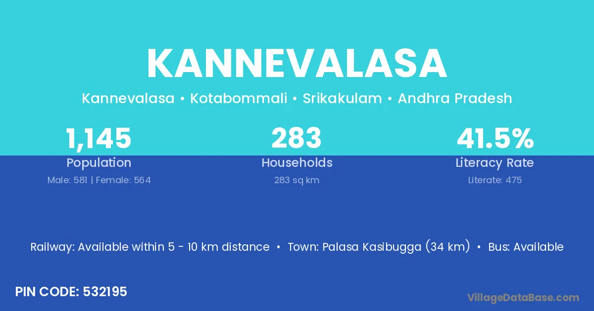 Palasa Kasibugga (34 km) is the nearest town to Kannevalasa village for major economic activities and is located approximately 34 km away.
