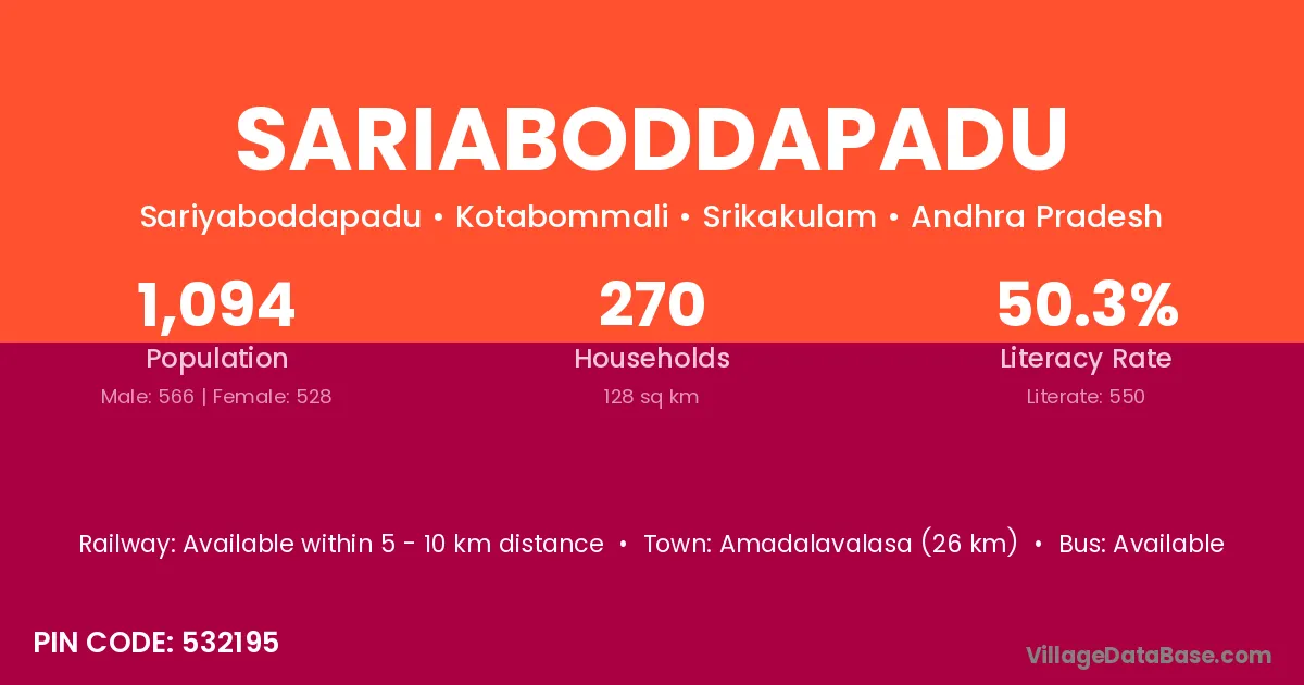 Amadalavalasa (26 km) is the nearest town to Sariaboddapadu village for major economic activities and is located approximately 26 km away.