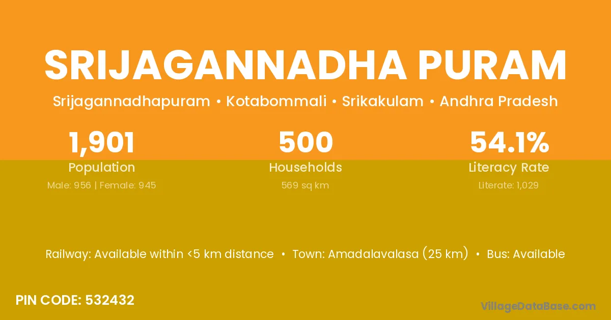 Amadalavalasa (25 km) is the nearest town to Srijagannadha Puram village for major economic activities and is located approximately 25 km away.