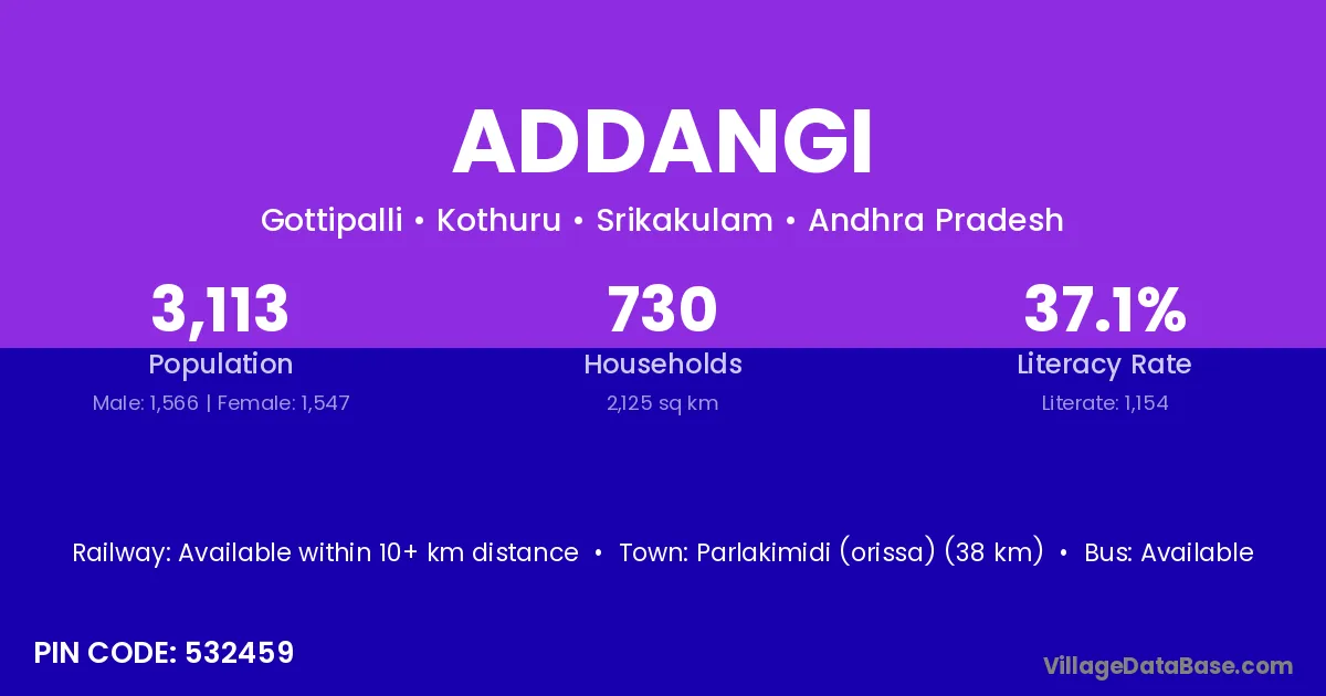 Parlakimidi (orissa) (38 km) is the nearest town to Addangi village for major economic activities and is located approximately 38 km away.
