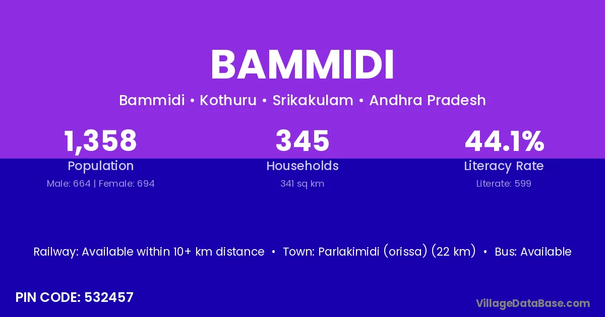 Bammidi village has a total population of 1,358 people, of which 664 are males and 694 are females.