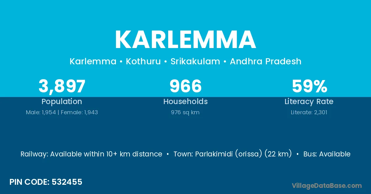 Parlakimidi (orissa) (22 km) is the nearest town to Karlemma village for major economic activities and is located approximately 22 km away.