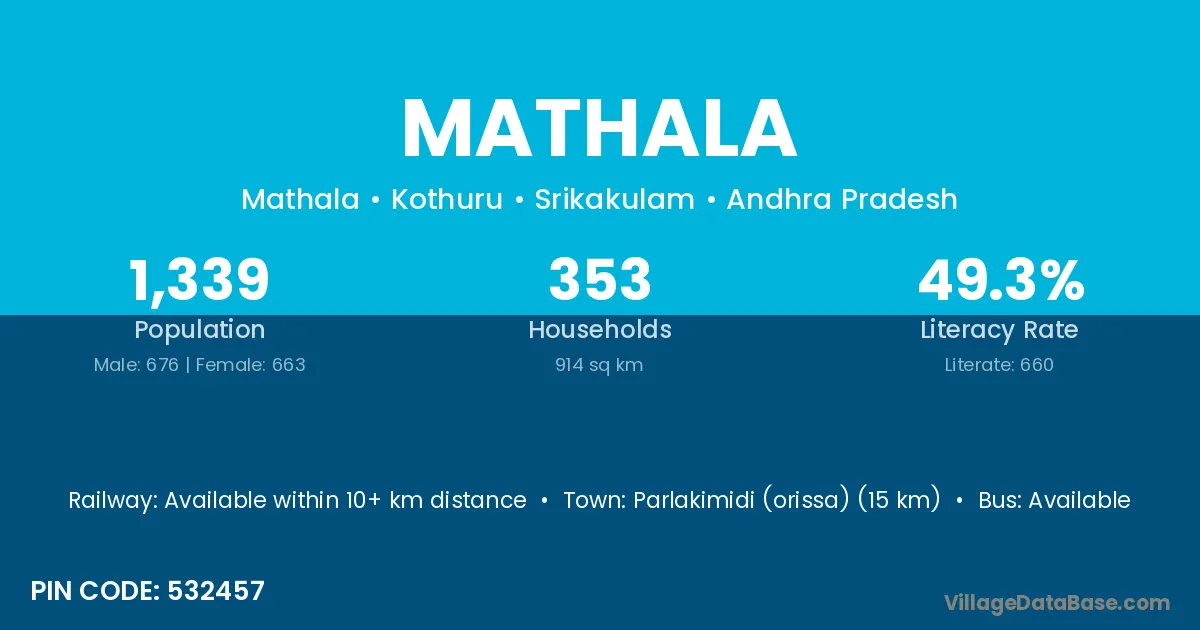 Parlakimidi (orissa) (15 km) is the nearest town to Mathala village for major economic activities and is located approximately 15 km away.