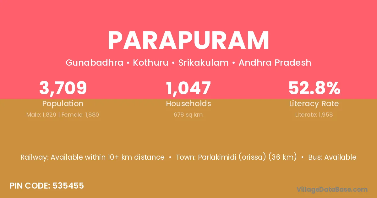 Parlakimidi (orissa) (36 km) is the nearest town to Parapuram village for major economic activities and is located approximately 36 km away.