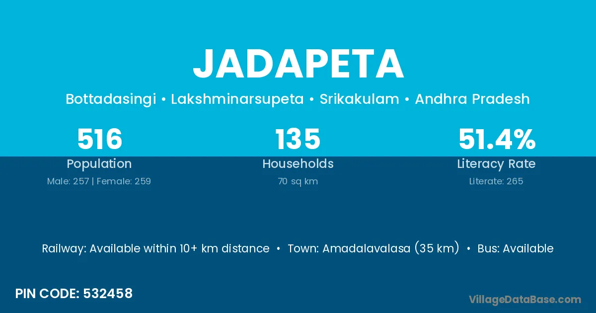 Jadapeta village has a total population of 516 people, of which 257 are males and 259 are females.