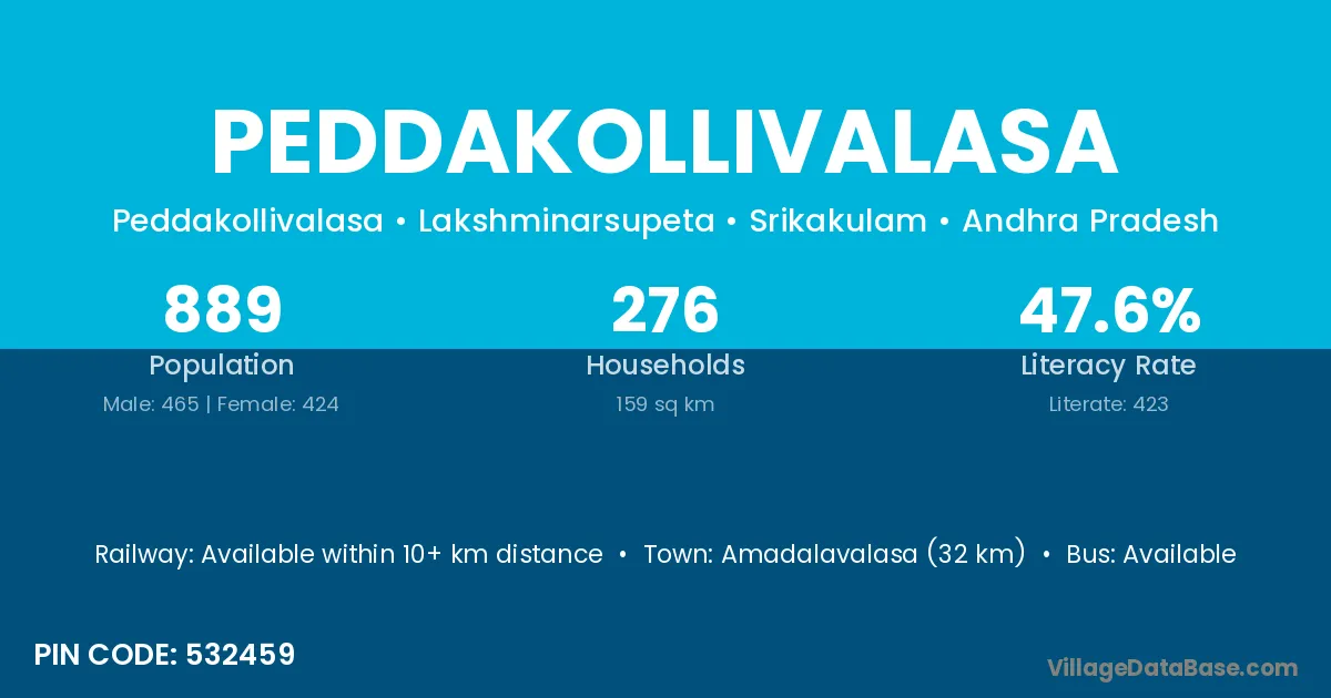 Amadalavalasa (32 km) is the nearest town to Peddakollivalasa village for major economic activities and is located approximately 32 km away.