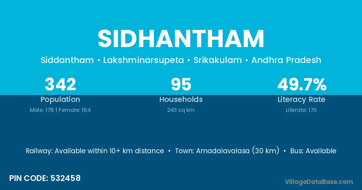Amadalavalasa (30 km) is the nearest town to Sidhantham village for major economic activities and is located approximately 30 km away.